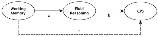 Based on the single-indicator latent variables, we applied structural equation modeling (SEM) to test whether working memory explains CPS variance above and beyond fluid reasoning. To do so, we first estimated Model 1 as presented in Figure 3. In this model, CPS variance is directly explained by fluid reasoning (path b in Figure 3), in which variance is explained by working memory (path a in Figure 3). In the next step, we estimated Model 2, in which we added a direct path from working memory to CPS in Model 1 (path c in Figure 3). Based on these two models, the incremental explained CPS variance (Δ R2) was evaluated based on a hierarchical F test (Cohen et al. 2003, p. 171, formula 5.5.1) with α = 0.003 (= 0.05/16; Bonferroni correction). The 95% CIs of the standardized regression weights and of the explained variances were calculated based on 5000 bootstrapped draws. For all models, maximum likelihood (ML) estimation was used. Model fit of Model 1 was evaluated based on standard fit indices and the commonly used cutoff values (e.g., Schermelleh-Engel et al. 2003). Specifically, we used the χ2 goodness-of-fit statistic (p > 0.05), Comparative Fit Index (CFI ≥ 0.97), Root Mean Square Error of Approximation (RMSEA ≤ 0.05), and Standardized Root Mean Square Residual (SRMR ≤ 0.05). Model 2 was fully saturated (i.e., with zero degrees of freedom); thus, model fit could not be evaluated.