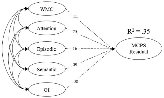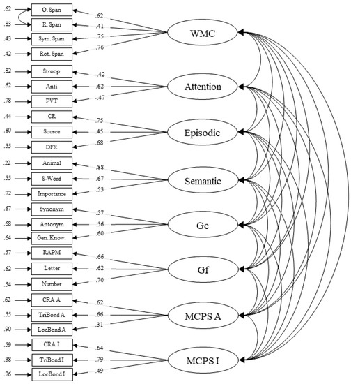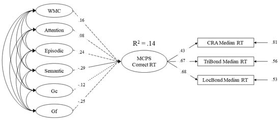 Table 7 shows latent correlations between cognitive abilities and response times for problems correctly solved (i.e., conditionalized response time). Unlike Model 2, only semantic memory and crystallized intelligence latent factors were significantly correlated with conditionalized response times. Additionally, only semantic memory was found to be a unique predictor of conditionalized response times and accounted for 14% of the variance (