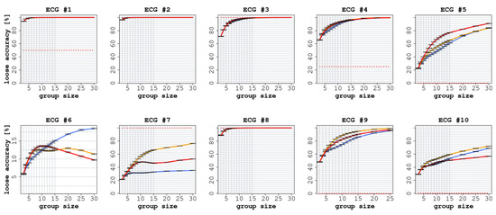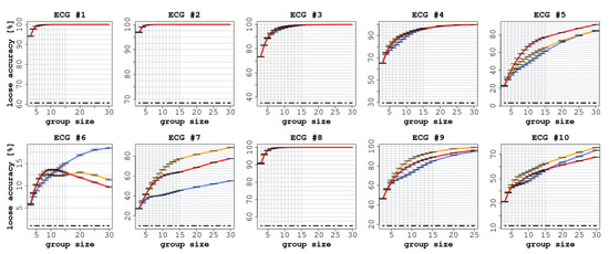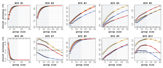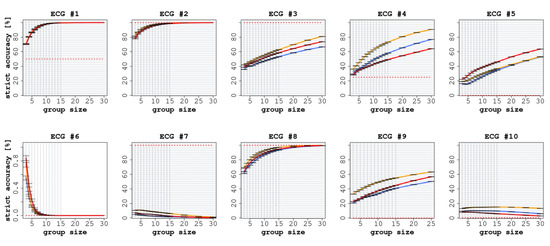 In terms of SA, we observed an improvement in all cases except for ECGs 6, 7, and 10 (in the latter case, only the confidence aggregation rules constantly improved when the group size increased). The improvements ranged from 30.8 percentage points (CI: 95% 30.3 ÷ 31.2) for ECG 9 to 61.3 (CI: 95% 60.9 ÷ 61.8) for ECG 4, as shown in Figure 2, and were statistically significant ().