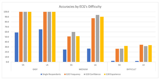 Each ECG had a different number of readers (between 75 and 140), as shown in Table 2. In all ECGs, we observed a significant improvement in accuracy (both SA and LA) when comparing the performance of individual readers with the CI groups, as reported in Figure 2 and Figure 3.