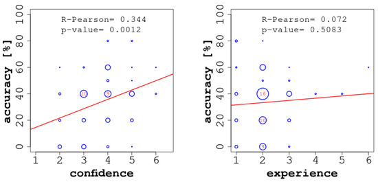 Correlations between accuracy and confidence (on the left) and between accuracy and experience (on the right). In each of the two diagrams, we report the Pearson correlation coefficient () and the corresponding p-value.