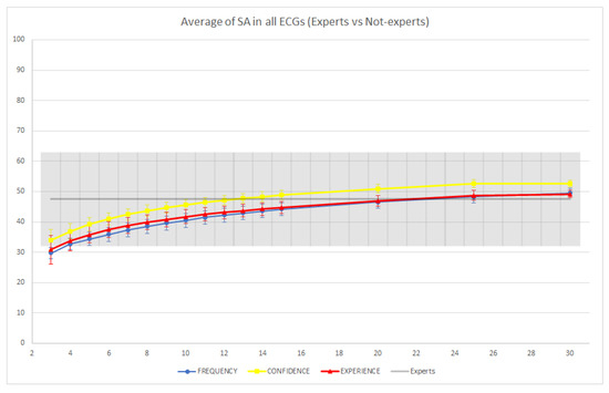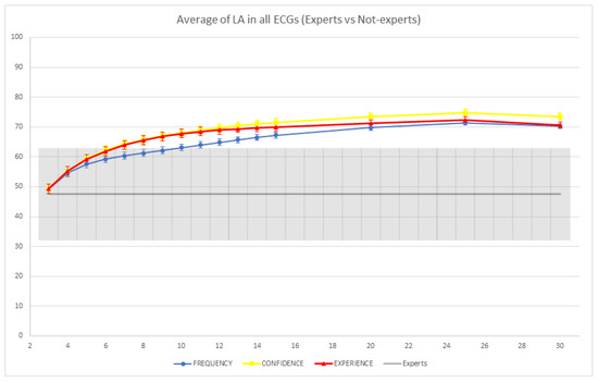 In Figure 8 and Figure 9, we report the average performance of both the groups of non-experts and the individual expert readers across the 10 ECGs. In terms of SA, we observed that the average performances of the groups and individual experts were not significantly different (i.e., the confidence intervals overlapped). However, we observed a slight improvement of the confidence-based aggregation protocol in comparison with the performance of the experts when groups with more than 14 readers are involved, while the other two CI protocols seemed to require larger groups to achieve an improvement. In terms of LA, we observed that groups of non-experts involving as few as eight readers were able to significantly improve over the performance of the individual expert readers (using the confidence or experience-based CI protocols), and, on average, all CI groups were able to improve on the performance of individual readers. In conclusion, this shows that even without expert readers, the application of CI techniques could be useful to reduce diagnostic errors, and this reduction (with appropriately sized CI groups and CI aggregation protocols) could be even greater than what could be achieved through standard second reading protocols, which usually involve only a single (expert) reader.