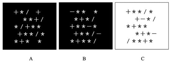 Three treatment levels were designed to stimulate different types of executive processes. The first level included plus signs only, and the second and third levels included both plus and minus signs. Compared to the first level, the other two levels additionally demanded shifting since participants had to switch between forward and backward counting. In addition, the third level differed from the second level in the counting rule which required participants to count the number of stars in a backward manner after coming across a plus sign but in the forward manner after seeing a minus sign. The change of the rule was indicated by the change in colors of symbols and background. White symbols together with a black background signified the outset state of the rule (see Figure 1A,B). The reversal of the counting rule was signified by black symbols together with a white background (See Figure 1C). The reversal of the overlearned rule was supposed to place extra demands on inhibition. All trials required participants to track and count the relevant stimuli (i.e., stars) while updating the number of stars in working memory. There were five practice trials and 36 experimental trials. The sequence of trials from different levels was pseudo-randomized. The dependent variable was the percentage of trials completed correctly in each level.