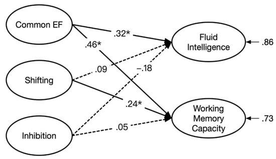 The prediction of fluid intelligence and working memory capacity with three latent factors underlying the star counting task including common EF, shifting, and inhibition as predictors (* p < .05).