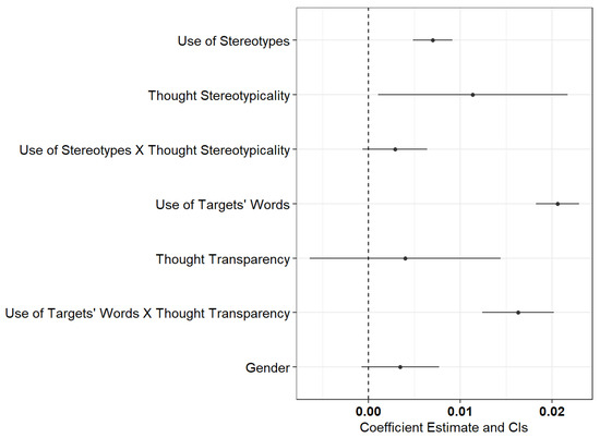 Consistent with the fifth hypothesis, the results of the simple slopes analysis indicated that when targets’ thoughts were high on transparency (+1 SD), perceivers’ use of the targets’ words significantly, positively predicted empathic accuracy, b = .03, p < .001. However, contrary to our expectation, when targets’ thoughts were low on transparency (−1 SD), perceivers’ use of the targets’ words was still a significant predictor of empathic accuracy, b = .01, p < .001.