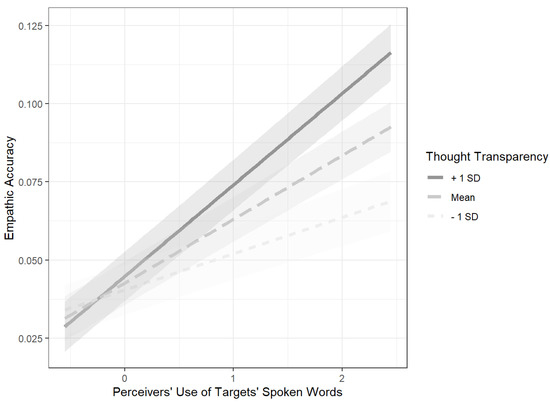 Transparency of the targets’ thoughts will interact with perceivers’ use of the targets’ spoken words such that the perceivers’ use of the targets’ spoken words will only positively predict empathic accuracy when the targets’ thoughts are highly transparent (i.e., when targets are saying out loud what they also report thinking).