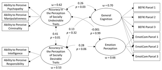 The structural model had excellent fit to the data (χ2(37) = 43.90, p = 0.20, RMSEA = 0.038, CFI = 0.976, SRMR = 0.054), and all factors had acceptable factor saturation, as indicated by omega hierarchical estimates (McDonald 1999). Overall, we found both trait perception factors were positively correlated. Likewise, accuracy in the perception of socially undesirable traits was significantly correlated with general cognition but not emotion perception. Accuracy in the perception of socially desirable traits was unrelated to general cognition; however, it was significantly related to emotion perception ability (assuming a one-tailed p value).