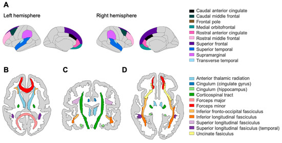 (A) Grey matter ROIs based on the Desikan–Killiany atlas (cortical volume, N = 246) in the left and right hemisphere. White matter ROIs based on the John’s Hopkin’s University atlas (fractional anisotropy, N = 165) in (B) transverse plane (superior), (C) coronal plane, and (D) transverse plane (inferior). Note that the frontal pole is not visible in these planes.