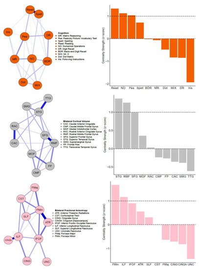 Regarding centrality, we report bridge strength (Figure 5). In the cognitive-grey matter network, three bridge nodes surfaced (in descending order: superior temporal gyrus, superior frontal gyrus, and rostral middle frontal gyrus, Figure 5, top left). In terms of stability, the CS coefficient was 0.20, indicating that the bridge strength estimates were unstable under bootstrapping conditions. In the cognitive-white matter bi-layer network, three nodes (in descending order: uncinate fasciculus, inferior frontal-occipital fasciculus, and hippocampal cingulum) emerged as possible bridge nodes (Figure 5, top right). Moreover, the centrality estimates had a CS coefficient of 0.13, once again suggesting that the bridge strength estimates were unstable. Lastly, for the tri-layer network, five nodes displayed positive bridge strength equal to or greater than one standard deviation above the mean (Figure 5, bottom center). These included (in descending order): reading, peabody picture vocabulary test, superior frontal gyrus, spelling, and numerical operations. Much better than the bi-layer networks, the tri-layer network bridge strength estimates were moderately stable (CS coefficient = 0.44).
