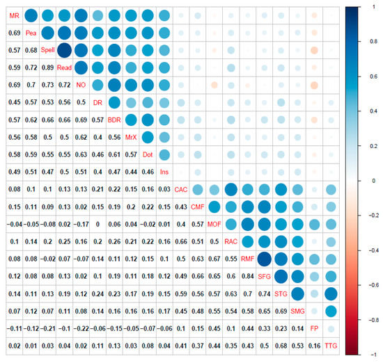 (Top) Correlation plot for cognitive raw scores and bilateral cortical volume ROIs. (Middle) Correlation plot for cognitive raw scores and bilateral fractional anisotropy ROIs. (Bottom) Correlation plot for bilateral cortical volume and bilateral fractional anisotropy ROIs. All coefficients shown are Pearson correlations. Blue represents positive correlations while red signifies negative correlations among variables. Size of circles indicates the magnitude of the association (e.g., larger circle = higher correlation). Correlations calculated using pairwise complete observations. Abbreviations: matrix reasoning (MR), peabody picture vocabulary test (Pea), spelling (Spell), single word reading (Read), numerical operations (NO), digit recall (DR), backward digit recall (BDR), Mr. X (MrX), dot matrix (Dot), following instructions (Ins), caudal anterior cingulate (CAC), caudal middle frontal gyrus (CMF), medial orbital frontal cortex (MOF), rostral anterior cingulate gyrus (RAC), rostral middle frontal gyrus (RMF), superior frontal gyrus (SFG), superior temporal gyrus (STG), supramarginal gyrus (SMG), frontal pole (FP), transverse temporal gyrus (TTG), anterior thalamic radiations (ATR), corticospinal tract (CST), cingulate gyrus (CING), cingulum (hippocampus) (CINGh), inferior fronto-occipital fasciculus (IFOF), inferior longitudinal fasciculus (ILF), superior longitudinal fasciculus (SLF), uncinate fasciculus (UNC), forceps major (FMaj), and forceps minor (FMin).