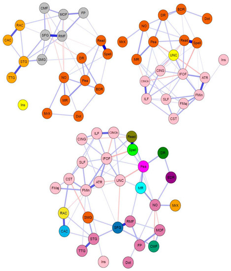 Network visualizations (spring layout) of partial correlation multilayer networks for CALM data. Colors indicate groups determined by the Walktrap algorithm (see above). (Top) Bi-layer networks consisting of cognition and grey matter (top left), and cognition and white matter (top right). (Bottom) Tri-layer network consisting of cognition, grey matter, and white matter (center).