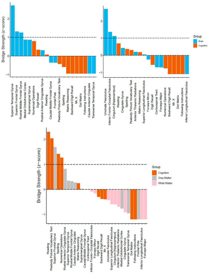 Further inspection of bridge strength centrality showed an interesting pattern: (discounting the one standard deviation cutoff) the neural nodes are stronger than the cognitive variables within the multilayer networks, despite there being an equal number of cognitive nodes for each brain metric. This is possibly due to the large number of edges between them (grey and white matter regions) and both cognitive and other neural nodes. In other words, since the neural nodes contain a larger number of connections (partial correlations) across explanatory levels, they display greater bridge strength (bridge strength sums inter-network correlations).