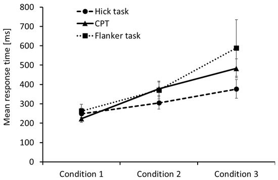 Mean response times in the three conditions of the flanker task, the continuous performance test (CPT), and the Hick task, respectively. Error bars represent the corresponding standard deviations.