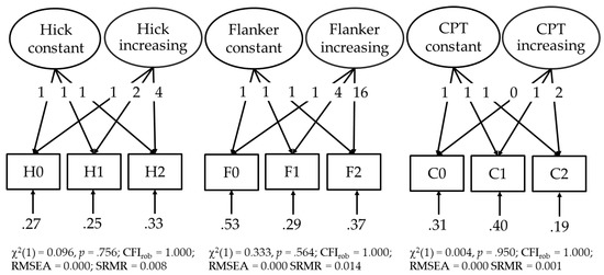 Fixed-links models for the Hick task, the flanker task, and the continuous performance test (CPT). Unstandardized factor loadings are presented as well as model fit by the χ2 test, the robust comparative fit index (CFIrob), the root mean squared error of approximation (RMSEA), and the standardized root mean square residual (SRMR).