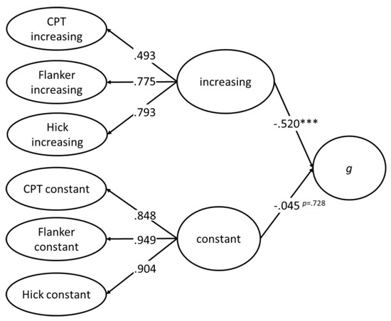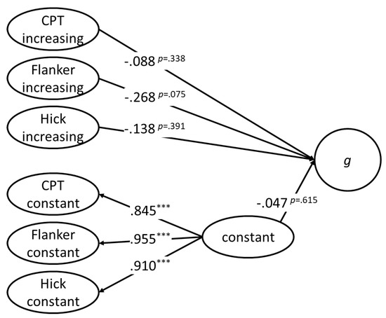 Proceeding from the model depicted in Figure 5, we tested whether one of the first-order latent variables with increasing factor loadings could explain portions of variance in g above and beyond the variance explained by the second-order latent variable. When simultaneously considering all three additional regressions, the process of estimation did not converge so that three separate models were computed. In these models, the regression coefficients were β = −.140, p = .444, and β = .001, p = .995 for the flanker task and the continuous performance test, respectively. No model explained the data better than the more parsimonious model without these additional regressions. For the Hick task, the model did not converge.