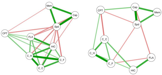 Network analysis based on Pearson correlations (left panel) and partial correlations (right panel) between three aspects of psychometric intelligence (BIS-Capacity, BIS-Speed, and BIS-Memory), sustained attention, selective attention, and speed of decision making, as well as three variables representing basic speed in the three experimental tasks. Green and red edges indicate positive and negative relationships, respectively. Only the (partial) correlations that reached statistical significance (p < .05) are presented. Abbreviations: Cap = BIS-Capacity; Mem = BIS-Memory; Spd = BIS-Speed; CPT = factor scores of the latent variable with increasing factor loadings from the continuous performance test (sustained attention); FLA = factor scores of the latent variable with increasing factor loadings from the flanker task (selective attention); HIC = factor scores of the latent variable with increasing factor loadings from the Hick task (speed of decision making); C_C, C_F and C_H = factor scores of the latent variables with constant factor loadings from the CPT (C_C), the flanker task (C_F), and the Hick task (C_H).