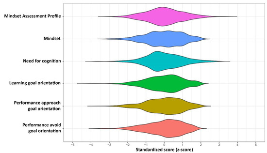 Descriptive statistics are presented in Table 1 and distributions are presented in Figure 1. Of the questionnaires administered to participants, the Mindset Assessment Profile had the lowest reliability (α = .63, ω = .61). Table A1 in the Appendix A presents the inter-item correlations for the Mindset Assessment Profile. The correlations between the items varied in absolute magnitude from r = .05 to r = .49. Compared to the Mindset Assessment Profile, the Implicit Theories of Intelligence Questionnaire (“Mindset” in Table 1) had excellent reliability (α = .94, ω = .94). Indeed, the Mindset Assessment Profile had a significantly lower Cronbach’s alpha reliability estimate than the Implicit Theories of Intelligence Questionnaire, t = 38.89, p < .001 (Abd-El-Fattah and Hassan 2011). The other questionnaires had acceptable to good reliability, ranging from α = .72 to α = .87 (ω also ranged from .72 to .87).