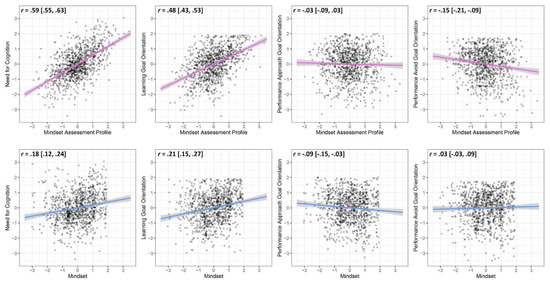 By contrast, items three, four, five, six, seven, and eight from the Mindset Assessment Profile correlated significantly more strongly with need for cognition (average r = .38) than with mindset (average r = .12); Steiger’s test for the difference between dependent correlations revealed zs ranging from 3.32 to 11.96, all ps < .001. Items three, four, five, six, seven, and eight from the Mindset Assessment Profile also correlated significantly more strongly with learning goal orientation (average r = .29) than with mindset (average r = .12); Steiger’s zs ranged from 2.07 to 9.90, all ps < .02. Items four and six from the Mindset Assessment Profile did not correlate significantly with mindset (rs = −.01, 95% CIs [−.07, .05], ps > .65).