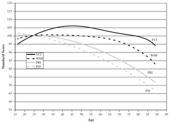 As shown in Figure 2, the Verbal Comprehension Index, which measures Gc, a maintained ability, increases through late middle age before starting its decline. By contrast, the other three Indexes are vulnerable abilities, with processing speed (Gs, measured by the Processing Speed Index) peaking at age 16½. The Perceptual Reasoning Index, which measures both fluid reasoning (Gf) and visual-spatial processing (Gv), peaked in the mid-20s. All three of these abilities decline dramatically and steadily through old age. Adults ages 75 to 90, when evaluated against a young adult reference group, earn mean standard scores between the mid-60s and low 80s in reasoning and speed (more than 1 to 2 standard deviations below the mean). Most mean values for this age group land squarely in the range sometimes referred to as Borderline Intellectual Functioning (the 70–79 range), coined by Terman (1916) to denote the slippery slope between intellectual disabilities, “and the higher group usually classified as normal but dull” (p. 87).