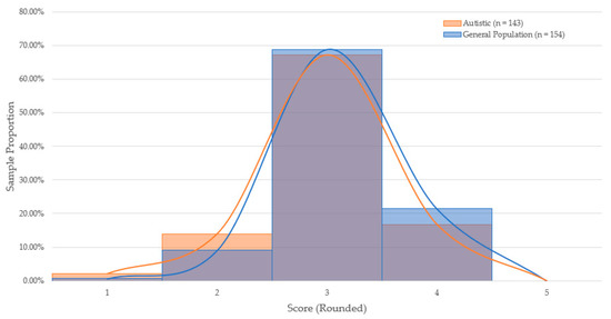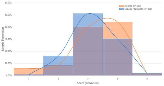 To test whether cognitive ability measurement varied significantly between autistic and general-population candidates, scores obtained in each game-based assessment were compared by group. Two one-way analyses of variance (ANOVA) were conducted to determine whether mean scores on the assessments varied as a function of group membership. Scores on the Disconumbers and Shapedance package did not significantly vary between the general-population (n = 169, M = 2.81, SD = 0.67) and autistic candidates (n = 120, M = 2.84, SD = 0.85): F(1,287) = 0.065, p = 0.80, and Cohen’s d = −0.04. Scores on the Digitspan and Shapedance package varied significantly between the general-population (n = 154, M = 2.65, SD = 0.49) and autistic candidates (n = 143, M = 2.53, SD = 0.58): F(1,295) = 3.721, p = 0.05, and Cohen’s d = 0.22. As shown in Figure 1 and Figure 2, the proportional distribution of scores appear roughly equal across both game packages. The hypothesis of the study was partially supported.