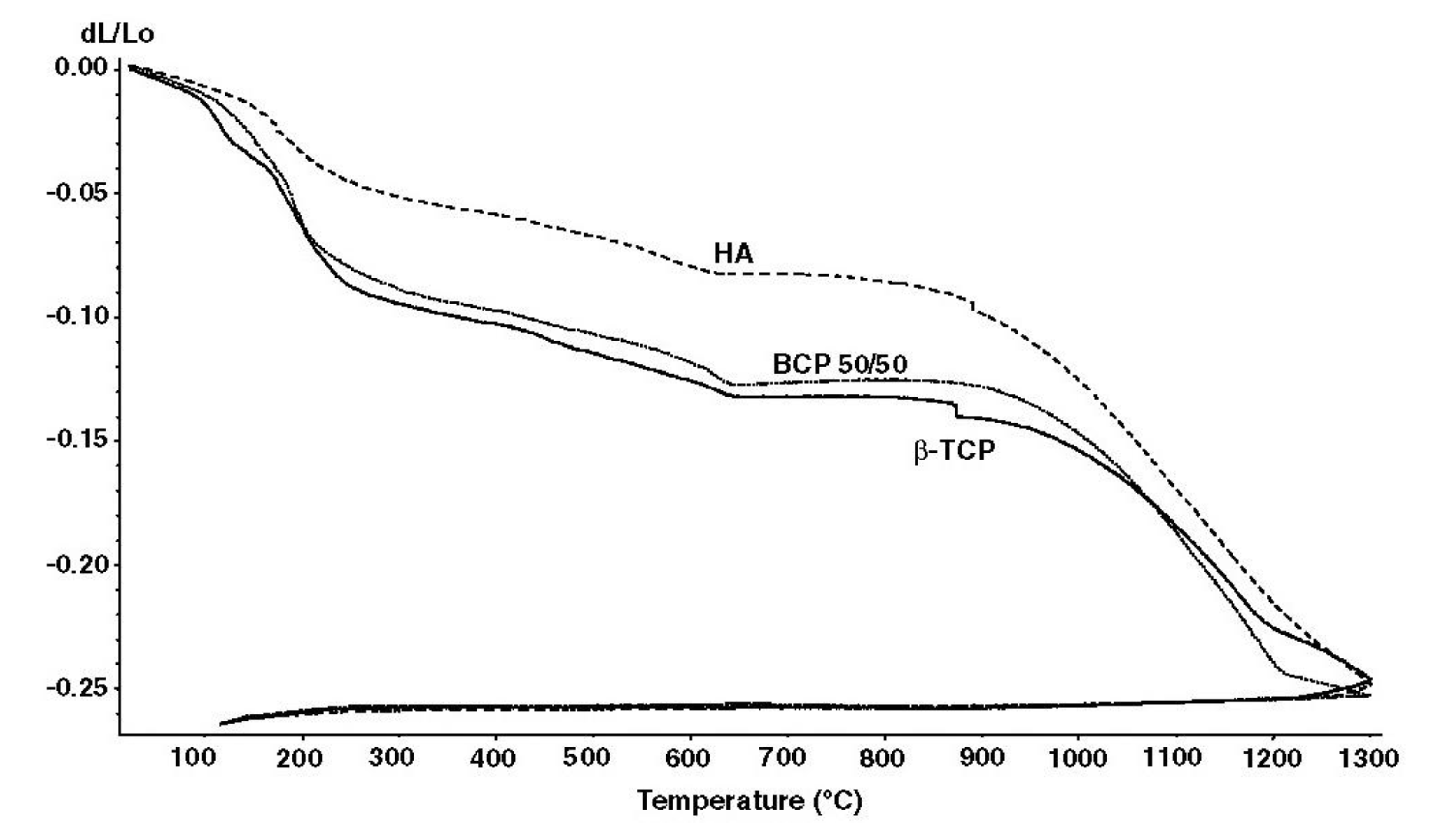 Linear shrinkage of the compacted ACP powders that were converted into β-TCP, BCP (50% HA + 50% β-TCP) and HA upon heating. According to the authors: “At 1300 °C, the shrinkage reached a maximum of approximately ~25, ~30 and ~35% for the compacted ACP powders that converted into HA, BCP 50/50 and β-TCP, respectively” [224]. Reprinted from [224] with permission.