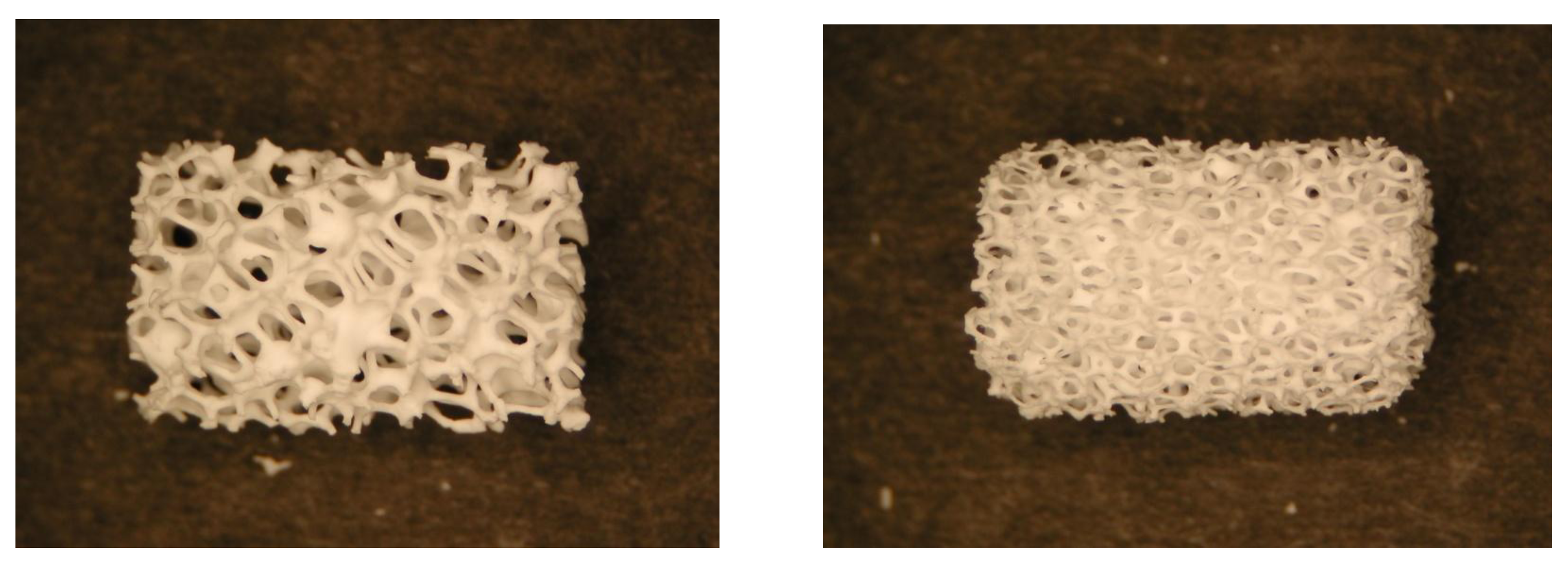 Photographs of a commercially available porous calcium orthophosphate bioceramic with different porosity. Horizontal field width is 20 mm.