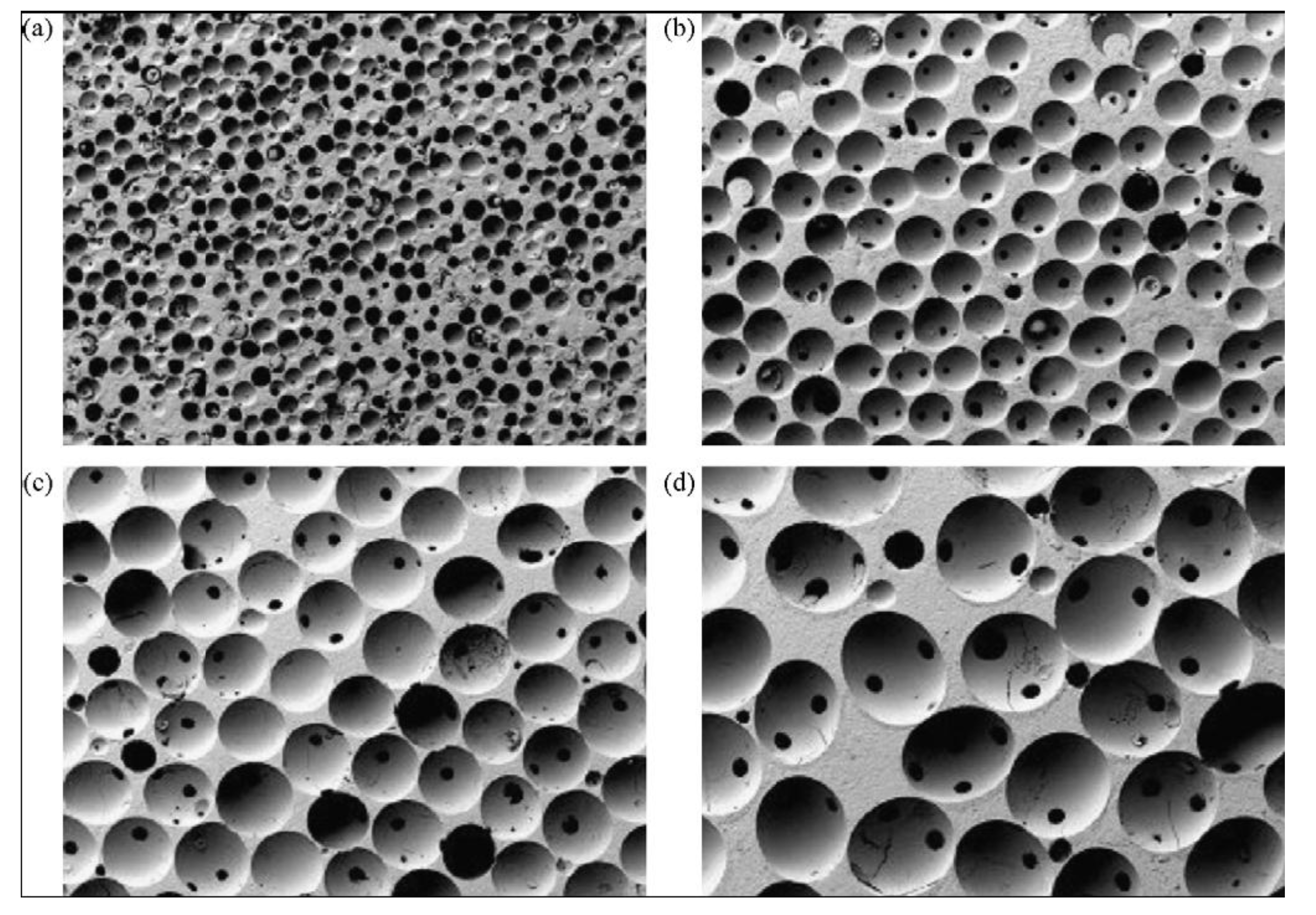 β-TCP porous ceramics with different pore sizes prepared using polymethylmethacrylate balls with the diameters: (a) 100–200; (b) 300–400; (c) 500–600 and (d) 700–800 μm. Horizontal field width is 45 mm. Reprinted from [377] with permission.