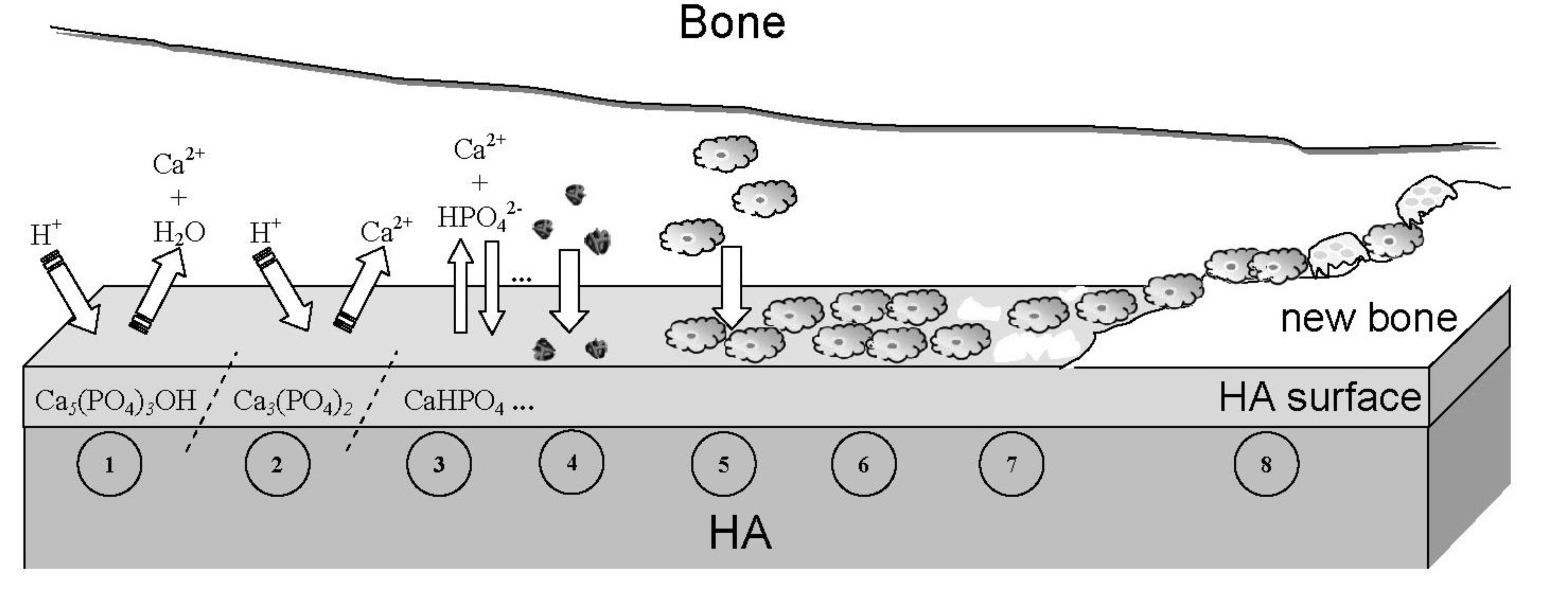 Interestingly, the electrical properties of calcium orthophosphate bioceramics appear to influence their biomedical applications. For example, there is an interest in polarization of HA bioceramics to generate a surface charge by the application of electric fields at elevated temperatures [310,311]. The presence of surface charges on HA bioceramics was shown to have a significant effect on both in vitro and in vivo crystallization of biological apatite [312,313,314,315,316]. Furthermore, growth of both biomimetic calcium orthophosphates and bones was found to be accelerated on negatively charged surfaces and decelerated on positively charged surfaces [316,317,318,319,320,321,322,323,324,325]. In addition, the electrical polarization of HA bioceramics was found to accelerate a cytoskeleton reorganization of osteoblast-like cells [326,327,328], extend bioactivity [329] and enhance bone ingrowth through the pores of porous HA implants [330]. There is an interesting study on the interaction of a blood coagulation factor on electrically polarized HA surfaces [331]. Further details on the electrical properties of calcium orthophosphate-based bioceramics can be found in [258,332,333,334,335,336].