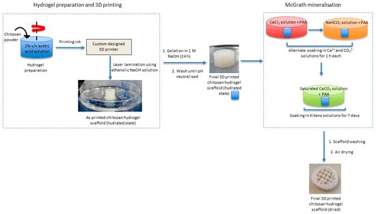 The McGrath mineralisation method was found to be an effective technique in developing calcium carbonate formations similar to those observed in nacre biomineralization in laboratory conditions on both carbohydrate-based and protein-based thin films [,]. The method involves soaking a porous wet biopolymer hydrogel thin film alternately in reactive mineral precursor ion solutions and then soaking the now preloaded scaffold in a saturated solution of calcium carbonate for a prolonged period. In the presence of polyacrylic acid (PAA), this mineralisation method results in the formation of uniformly distributed pancake-like CaCO3 crystallites throughout the thin film []. This morphology of CaCO3 crystallites is similar to what is observed during the early stages of growth during the nacre biomineralisation process []. Here, we investigate the prospect of using the McGrath method to achieve a similar mineral formation within the layered structure of 3D printed chitosan hydrogel-based scaffolds.