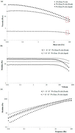 The log-log plots for the variation in (a) viscosity with increasing shear rate; (b) the storage (G′) and loss (G″) moduli as a function of strain (1 Hz, strain sweep); (c) G″ and G′ as a function of frequency, 2% strain (frequency sweep), for freshly prepared and aged 5% w/v chitosan hydrogel (Ch) prepared in 2% v/v acetic acid (AA). The estimated shear rate experienced at the tip of the printing nozzle is highlighted by the red boxes.