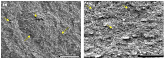 Cryo-scanning electron microscopy (SEM) images of air-dried chitosan hydrogel-based scaffolds (a) before and (b) after soaking in 1× PBS for 1 week. The yellow arrows highlight some of the nano/microscale pores within the region of observation. The scale bar is 1 μm.