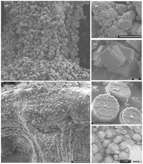 Scaffolds were mineralised when in their hydrated state via a combination of alternately pre-soaking the scaffolds in the precursor ion solutions followed by exposure to a saturated calcium carbonate solution (Kitano solution)–together herein called the McGrath method. SEM images of the resulting composites are shown in Figure 5 (alternate soaking in 0.1–0.5 M mineral precursor ion solutions for 24 h each followed by 7 days of soaking in Kitano solution). The mineralised scaffolds showed extensive CaCO3 formation in the regions of the scaffold directly exposed to the mineralisation media and in between the printed layers (Figure 5a–c). The resultant crystallites exhibit rhombohedral, spherical, rosette or stacked platelet-like morphologies.