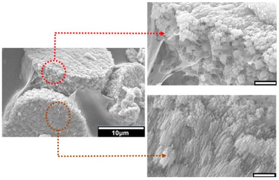 Furthermore, in the case of composites developed by mineralisation in the presence of PAA, at a higher magnification, it is observed that individual pancake-like crystallites are formed of oriented aggregates of numerous CaCO3 nanoplatelets. These aggregates are embedded within the chitosan polymeric matrix (Figure 6). This kind of physical association between the organic matrix and the mineral component is observed only when PAA is incorporated in the mineralisation method. Again this conforms with the results obtained when using 2D chitosan thin films [].