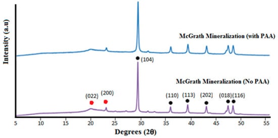 X-ray diffraction (XRD) plots for scaffolds mineralised via the McGrath method in the presence or absence of PAA. In both cases, 2.5% w/w PAA (with respect to the dry weight of the chitosan scaffold used) was present in all mineralisation solutions. The black and red dots represent the prominent 2θ peaks corresponding to calcite and crystalline regions within the chitosan scaffold respectively.