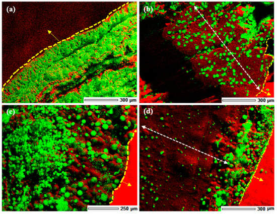 Energy dispersive spectroscopy (EDS) images of McGrath mineralised (in the presence of 2.5% PAA (with respect to the dry weight of the chitosan scaffold used) chitosan hydrogel-based scaffolds fabricated via (a,b) 3D printing and (c,d) bulk gelation. (a,c) Show the external surface of the scaffolds directly in contact with the mineralisation solution and (b,d) show the transverse cross-section of the scaffolds (i.e., the region not exposed directly to the mineralisation solution). Calcium is shown in green and carbon in red. The regions marked by the white arrows represent those that were not exposed to the mineralisation solution directly. The regions marked by yellow dashes and arrows represent the external surfaces that are not a part of the scaffold.