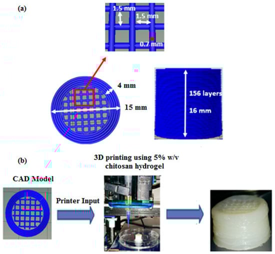 The first report on 3D printed chitosan hydrogel-based scaffolds was in 2002, which indicated good in vitro biocompatibility and enhanced osteoblast cell proliferation in symmetric lattice-based chitosan-hydroxyapatite composite scaffolds []. Geng et al. demonstrated the feasibility of using chitosan hydrogel-based inks in a dual extrusion robotic printer to print irregularly shaped cranial patches based on computed tomography scan images of the region that were converted to printer compatible models []. Furthermore, Lim et al. experimented with the application of cryogenic rapid prototyping by using a cold printing platform to freeze the printed structures during printing in order to develop chitosan hydrogel-based scaffolds with controlled microarchitecture (pore size and pore orientation). They found that the scaffold architecture affected both cellular infiltration and neo-vascularisation []. More recently, Lee et al. found that 3D scaffolds developed via this method exhibited very low mechanical strength and thus were not applicable as load-bearing bone grafts. Nonetheless, these may be considered for soft tissue regeneration applications []. Almeida et al. studied the in vitro inflammatory responses of 3D printed chitosan scaffolds with different compartmental geometries and showed that these scaffolds promote adhesion and proliferation of monocytes and the mobility of macrophages. They also found that varying the surface geometry resulted in changing the proliferating-cell morphology and hence their inflammatory responses [].