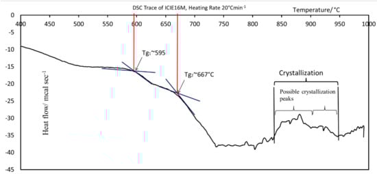 The DSC for ICIE16M glass particles was conducted to determine the glass transition temperature (Tg) and crystallization temperature (Tc) [60,61,62,63,64]. A 50 µg sample of the glass powder was heated at rates of 10 °C min−1 and 20 °C min−1 using Stanton-Redcroft DSC 1500 (PL Thermal Sciences, Epsom, UK) series. A starting temperature of 50 °C was used and final temperature of 1100 °C using a Nitrogen atmosphere.