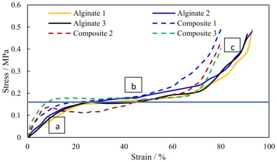 Representative stress-strain curves for pure alginate and composite scaffolds. (a) Elastic deformation region; (b) Plastic deformation region; (c) Densification region.