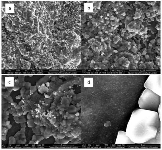 The composite scaffolds were assessed for bioactivity. An abundance of crystallites are seen to cover the surface of composite bone scaffold, as seen in the SEM image (Figure 8). Some specimens exhibited crystal growth after 120 h of submersion in SBF (Figure 6a–c), but for most samples, crystals appeared after two weeks, as shown in an earlier study [54,73]. The morphology of crystals also does not seem to be concurrent with that expected of hydroxyapatite crystals. These crystals exhibited cuboidal morphology (Figure 8c,d) of calcite formations.