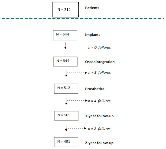 Flow-chart and follow-up of the implants (n = 544) study in 212 patients during 24 months. Number of failures that occurred at different stages of the study. Nine failures were recorded at different stages of the study: five during the osseointegration period and four after prosthetic loading.
