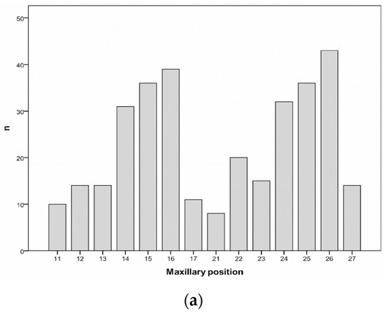 Distribution of the implants according to positioning. The number of implants per tooth position is depicted in the maxilla (a) and in the mandible (b), according to the World Dental Federation notation.