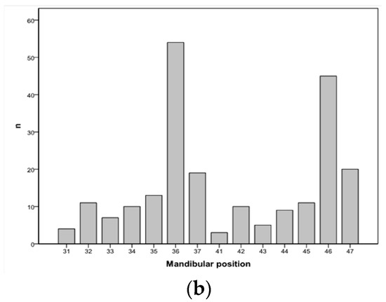 The majority of patients received between one and four implants (87.2%), while only three patients received 12 implants (Table 1). According to the distribution of the positioning, most of the implants were placed in the posterior region (Figure 2); 323 implants were placed in the maxilla (59.4%) and 221 in the mandible (40.6%). The most common placement site was 36 (9.9%) (lower left first molar), followed by 46 (8.3%) (lower right first molar).