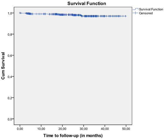 Implant survival Kaplan-Meier curves from start to end of follow-up (n = 544) to evaluate the effectiveness of the implant and its survival at two years (some implants were followed up to 50 months).