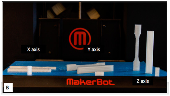 3D Printed polylactic acid (PLA) constructs (compression cylinders, flexural bars and dog-bone shape) in different orientations.