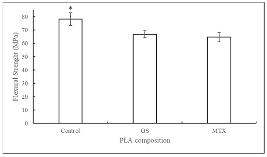 Flexural strengths of PLA constructs printed with control, GS, and MTX (mean ± SD, n = 5). * for p < 0.05.
