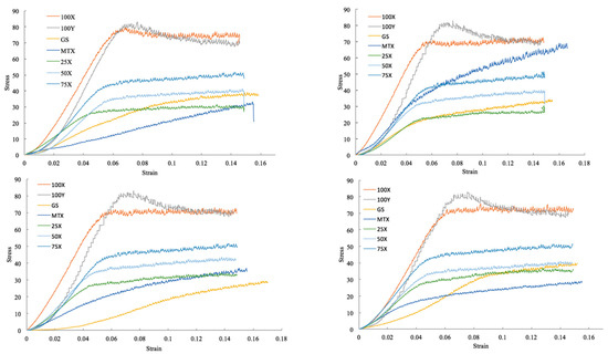 Unlike flexural strengths, compression strengths of the samples printed with different infill ratios showed a significant difference in their mean values. The graph in Figure 7 shows the stress–strain curves of PLA constructs, and Figure 8 shows the compression strengths of samples printed with different infill ratios and in various orientations. Samples printed at 100% infill ratio showed the highest compression resistance among other infills. There was no significant difference in means of compressive strengths printed at different orientations.