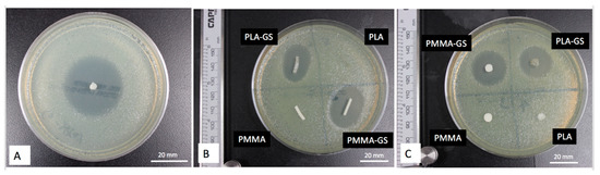 Zone of Inhibitions for E. coli cultures. (A) PLA–GS pellet, (B) PLA and PMMA filaments with and without GS, (C) PLA and PMMA discs with and without GS.