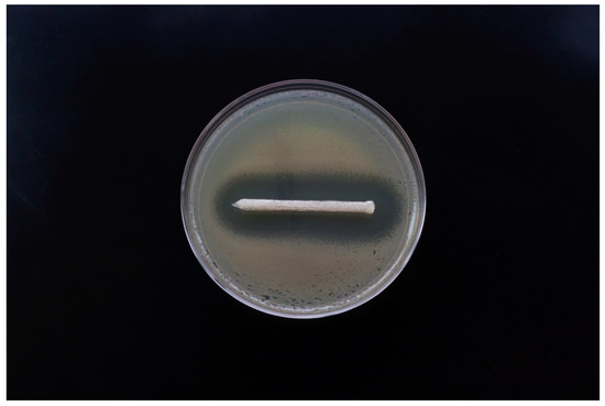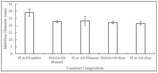 Figure 10 shows the zone of inhibition for GS-coated pellets, filaments, and 3D printed discs. PLA pellets coated with 2.5 wt. % GS showed an average of 29.04 mm diameter zone of inhibition. Control PLA and Poly (methyl methacrylate) (PMMA) filaments, as shown in Figure 10B, did not show any kill zones. Clear demarcating inhibition zones were seen for PLA and PMMA filaments loaded with GS. The mean zone of inhibition for 2.5 wt. % PLA–GS was 23.13 mm and for 2.5 wt. % PMMA–GS was 22.58 mm. ANOVA analysis showed no significant difference between the two means.