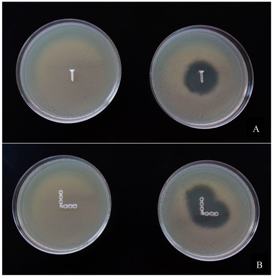 Bacterial growth Inhibition of E. coli on Mueller–Hinton agar plates. (A) 4 mm Screws, (B) bone plates.