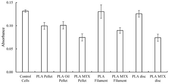 The XTT assay performed on osteosarcoma cell lines showed lower cell viability in wells containing PLA–MTX when compared with the control PLA groups, as shown in Figure 14, indicating the presence of chemotherapeutic properties in the 3D printed constructs.